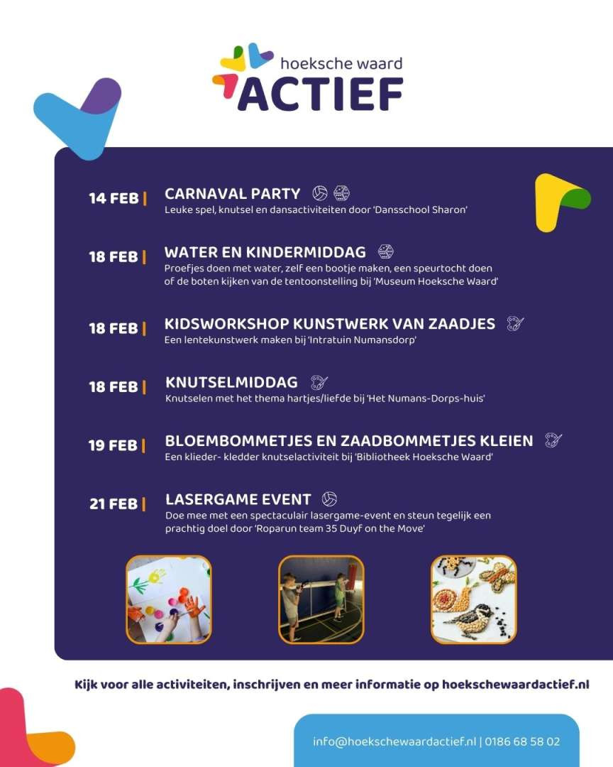 Eind deze week begint de voorjaarsvakantie. Er is genoeg te doen in de Hoeksche Waard. Sport- en knutselactiviteiten, creatief -en actief bezig zijn en nog veel meer. Hoeksche Waard Actief heeft een overzicht gemaakt en nodigen alle kinderen uit de Hoeksche Waard uit om deel te nemen die zij en hun partners organiseren. Hieronder en op de website van Hoeksche Waard Actief vind je het complete overzicht.